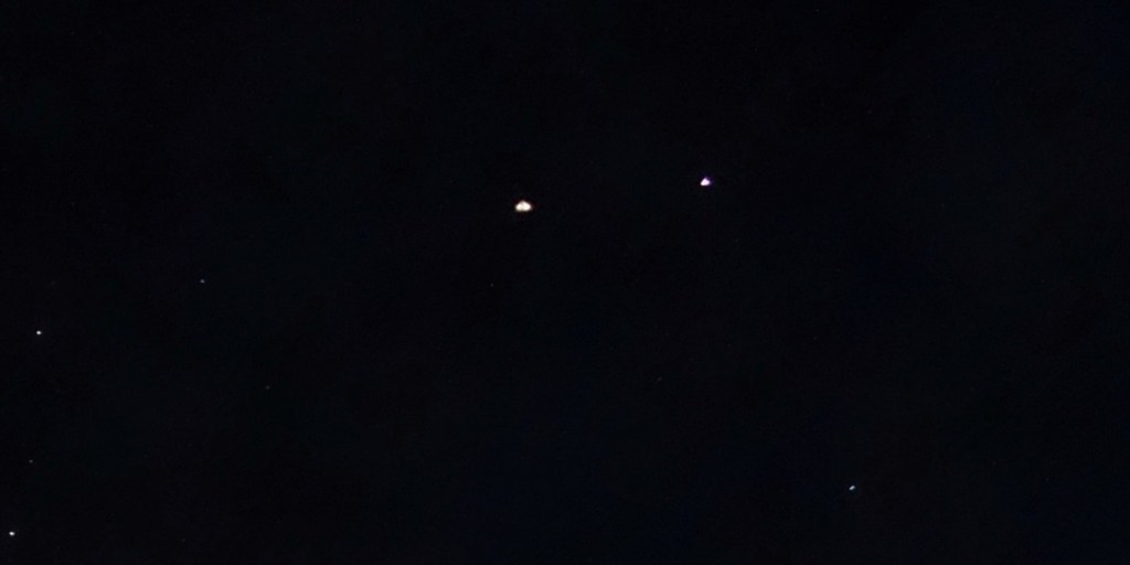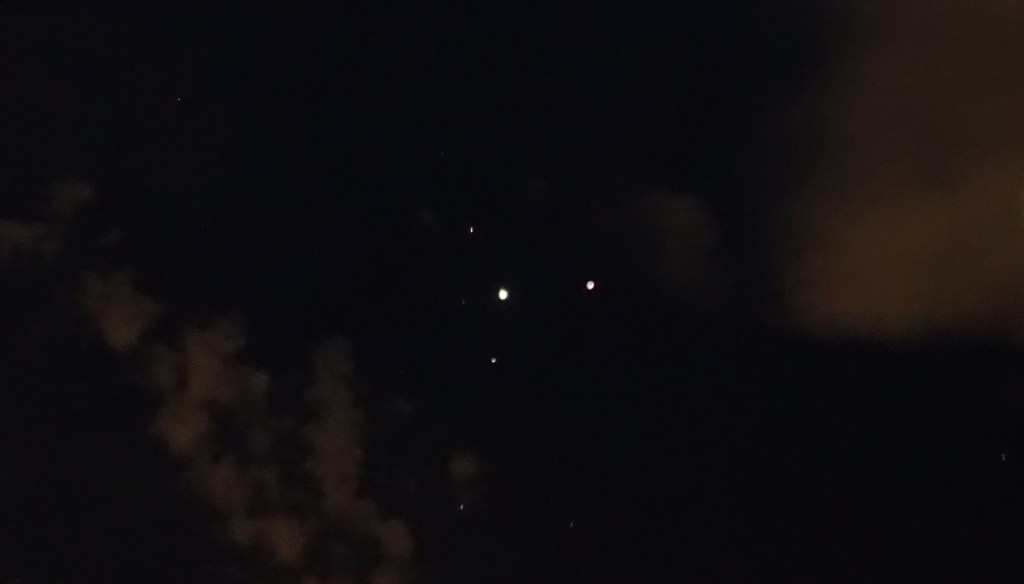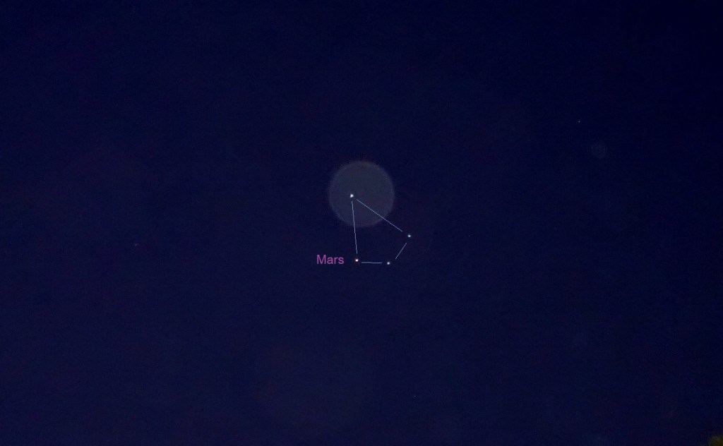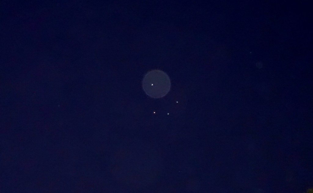 Photo taken on December 19th 2020, Darlington, Western Australia (three ships in formation with Mars, with an orb behind the upper ship).